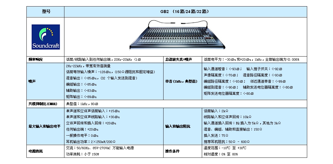 GB2它具有被设置成两组立体声编组的四编组母线和一个完整的 6 × 2 矩阵。适用于中小型的各类固定安装及音视频扩声等工程。GB2 有16 路、24 路和 32 路三款型号,每款型号都含两组立体声输入。每个输入通道都使用了在 GB4 和 GB8 中大受好评的 GB30 话筒前置放大器和GB30 均衡,同时 GB2 还具有 6 路辅助输出母线。