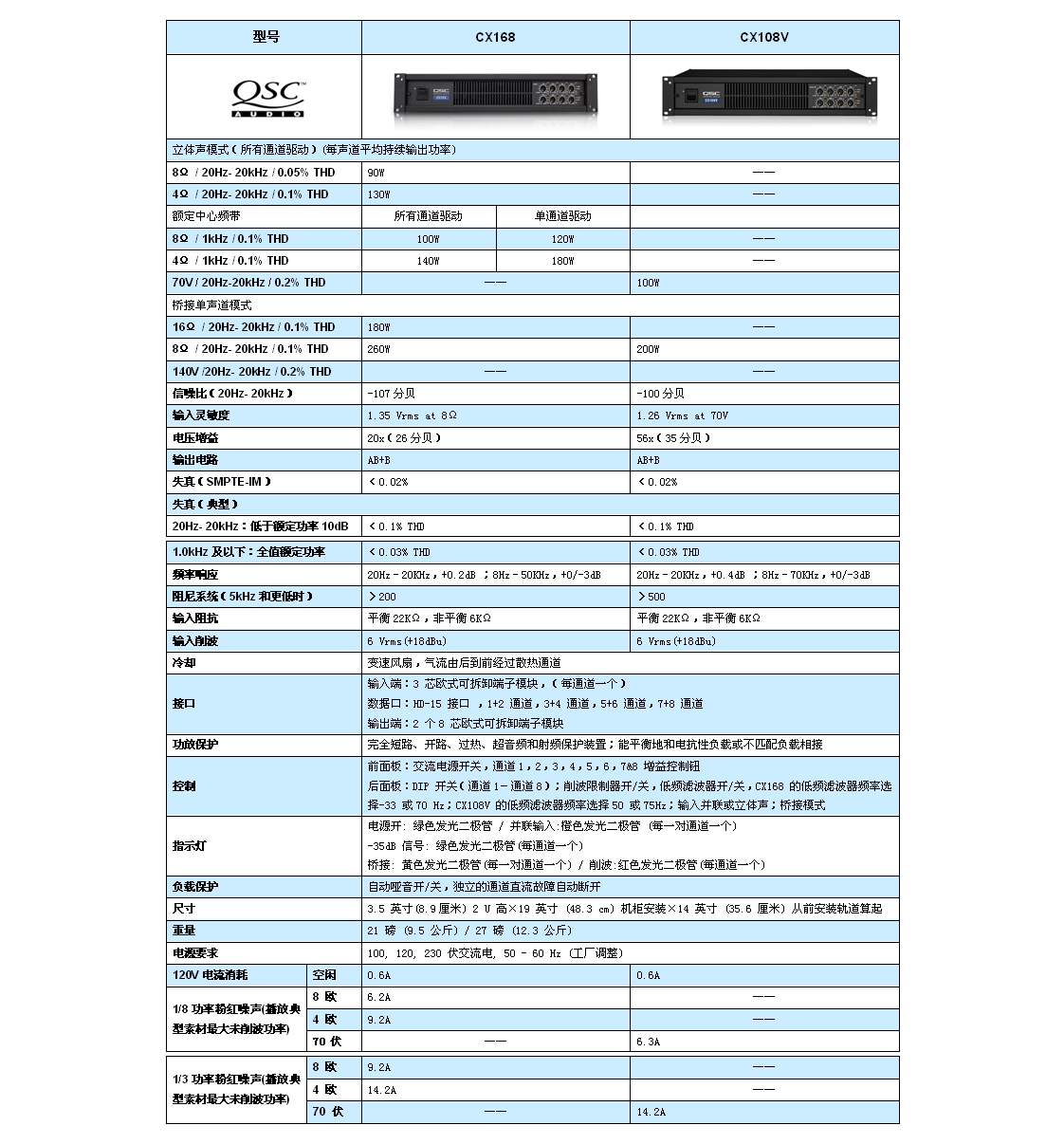 QSC 的 CX108V 和CX168 是为机柜空间有限的固定安装系统而设计的多通道功率放大器。CX108V 和CX168 在8 欧姆时70 伏时,每通道功率分别为100 瓦和90 瓦。这两种型号的每对通道都可以桥接,可以用作4 通道,5 通道,6 通道或8 通道的单元。与整个CX 系列一样,这个8 通道的型号带有可用于功放远程管理或信号处理的数据口。