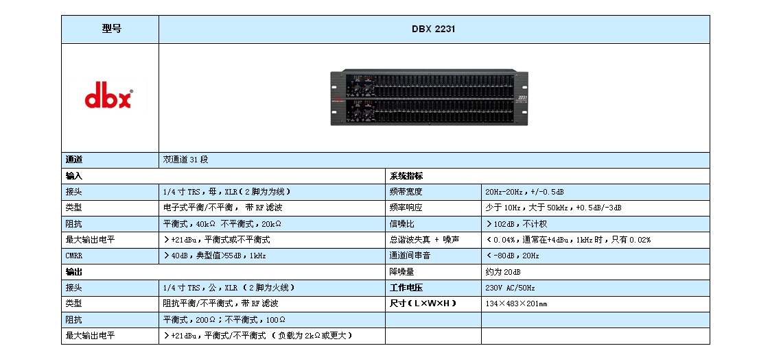 一般来说均衡器是整个信号流程中薄弱的一环。系统噪音经常因为均衡器而不能改善。Dbx 20系列均衡器的信噪比高达102dB,对于改善音响系统的总体指标是一个大大的惊喜。