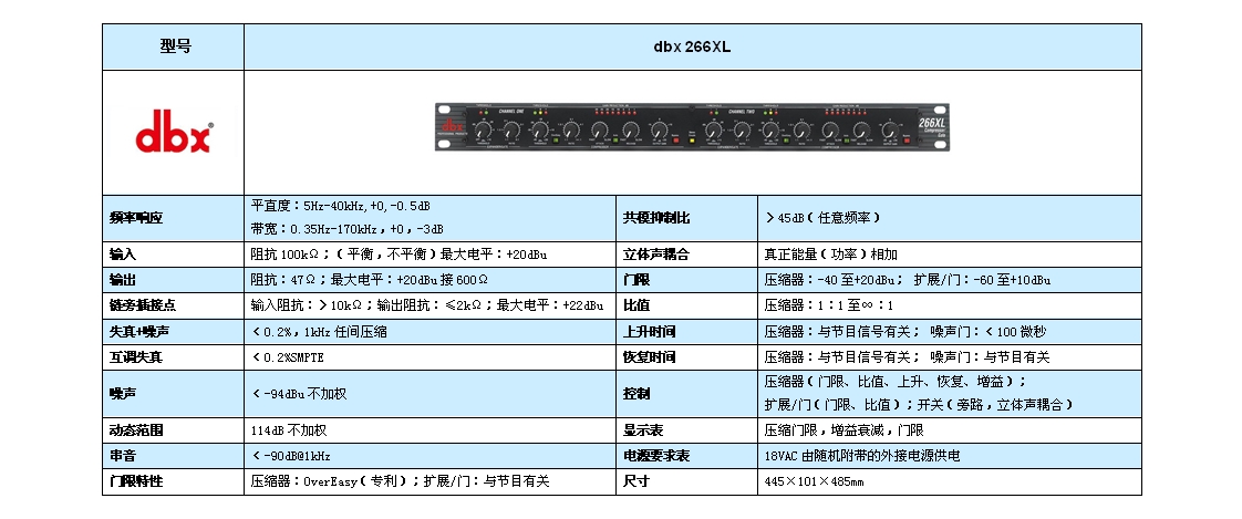 266XL应采用了最新噪声门电路,电路懂得分析不同的节目而运算一个最平滑的恢复特性。就算非常复杂的信号包括人导报和含有很多混响的信号,亦能胜任。DBX工程师利用了本厂专利的VCA(压控放大器)的技术优点——更阔的动态,更准确的放大线性确保DBX产品的门限和噪声门能优于对手。