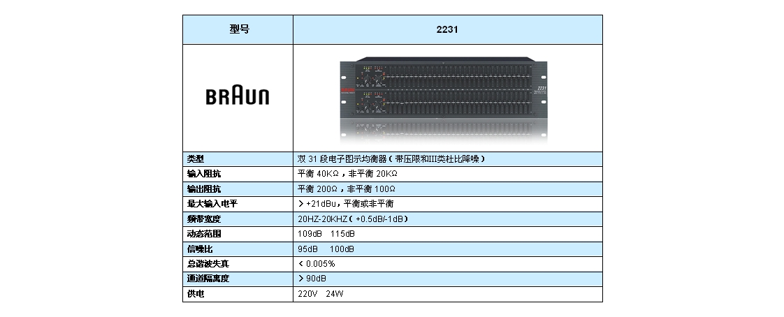 2231是在1231的基础上增加压缩限幅和Ⅲ类杜比降噪功能的均衡器。Ⅲ类杜比降噪功能的引入,有利于进一步降低系统的噪声,使得系统显得非常安静。动态范围大于120dB,失真度小于0.0025%,完全可以和专业级压缩限幅器比美。2231是集均衡器、压缩限幅器、Ⅲ类杜比降噪器等三种器材于一身的专业均衡器.