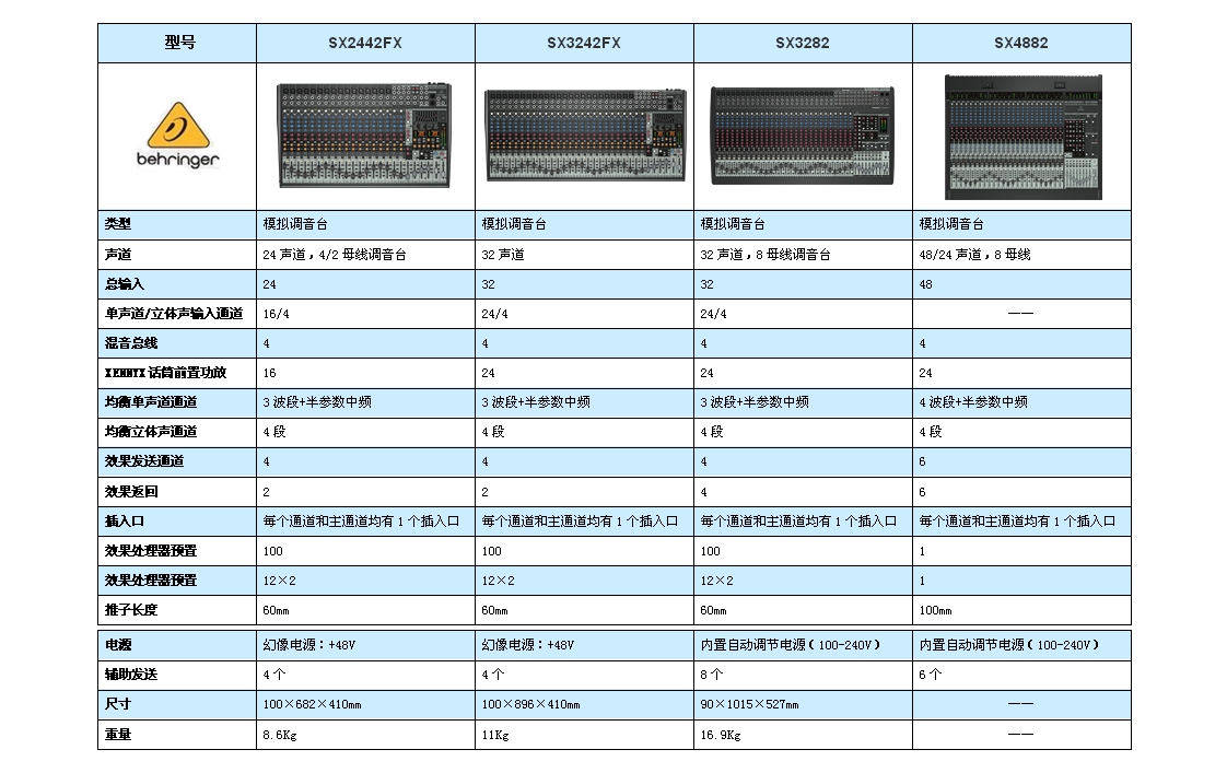 SX3242FX是Behringer最新SX系列调音台系列的32路4编组带效果器模拟调音台,SX系列比XENYX系列有着更低的噪音,但依然使用XENYX系列的话放。单声道通道有3段EQ,中频带扫频,声音很有英国味。