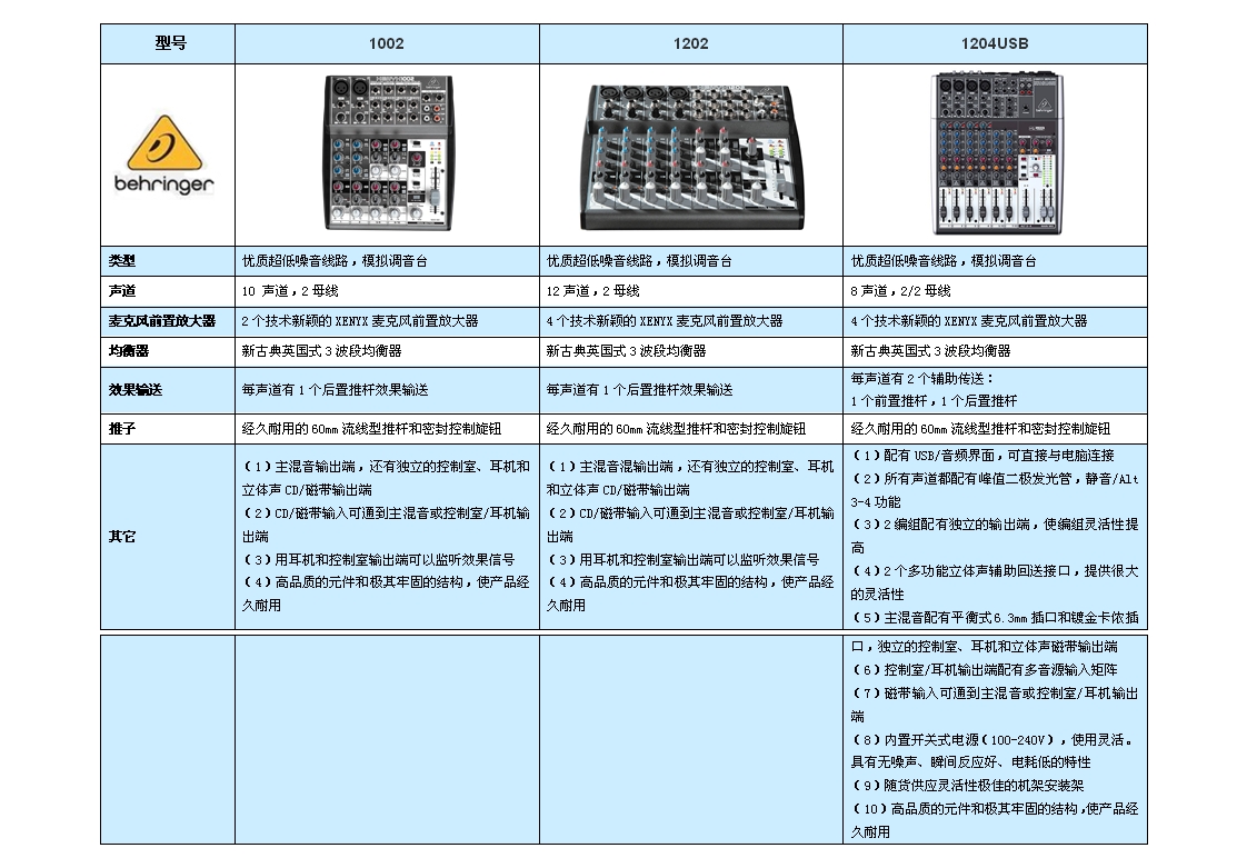 百灵达调音台 1204usb 调音台作为完美的小型现场演出的调音台以及家庭录音设置,1204usb为您提供具有xenyx麦克风前置放大器的4个单声道,新古典3频段英国式均衡器和2个立体声输入声道。 它绝不是一个“半成品”混频器,所有单声道的特点是“按钮”录音棚级压缩器和两个辅助发送器(每台配有一个前-后音量控制器)。 配有2个立体声辅助返回,与外部fx模块同时使用。内置usb音频接口可在进行音器与计算机之间的双向信号传输。 它是一种多功能产品,充满创造力。你随时准备将您的信息传递给公众。是否“过时”的技术阻挡着您通往成功的道路?您是否没有更多的时间进行专业录音?xenyx usb系列调音台就是为解决您现场音乐会而设计的,它可满足您高品味,专业质量录音的最先进的工具的需要。 由于其内置的usb /音频接口的设置,xenyxusb调音台配有将您的计算机系统成为一个完整的,高性能的家庭录音工作室所需要的所有录音和编辑软件。