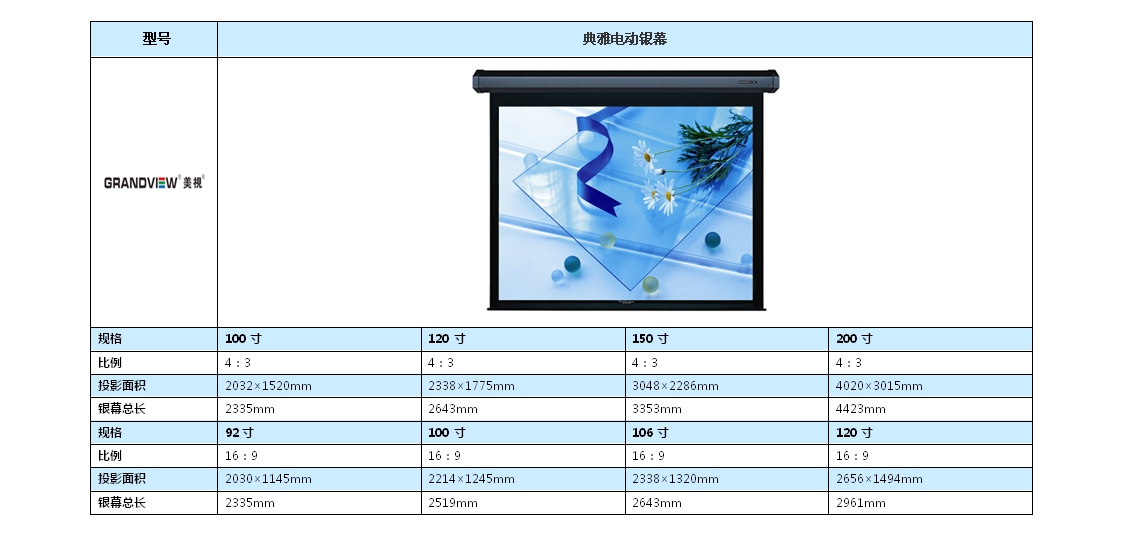 典雅系列银幕采用六角形金属彩板外壳,造型豪华庄重,而且即使在幕布尺寸高达240英寸时依然能够举重若轻,保持幕面平整。