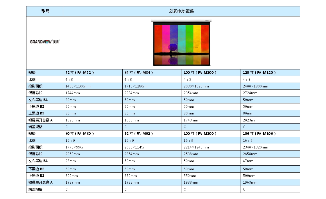 方形的外壳并没有让幻彩系列银幕从此趋于平凡,相反,让它更是沉稳凝重在平凡中显露出不平凡的本色。新一代幻彩系列银幕突破技术难题,运用先进制造工艺生产的铝合金一体式大大减少了因前后壳体连接造成的装配噪音,充裕的壳体空间让银幕尺寸可达300寸,灵活多样的安装方式可以从容应对任何固定安装场所的需要,丰富的操控选择让使用者轻松驾驭,享受商务演示的愉悦感受。