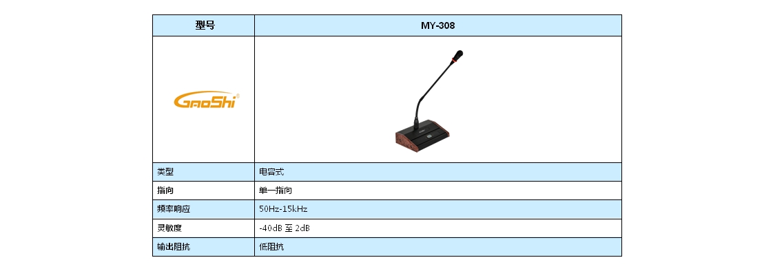本产品选用专业电容音头,具有单一强指向性、高灵敏度、频响特性、带前湊音、最新款式外形设计,高雅美观、线条流畅、特色显著,是供各种会议及广播、演讲、集会使用的专业麦克风。