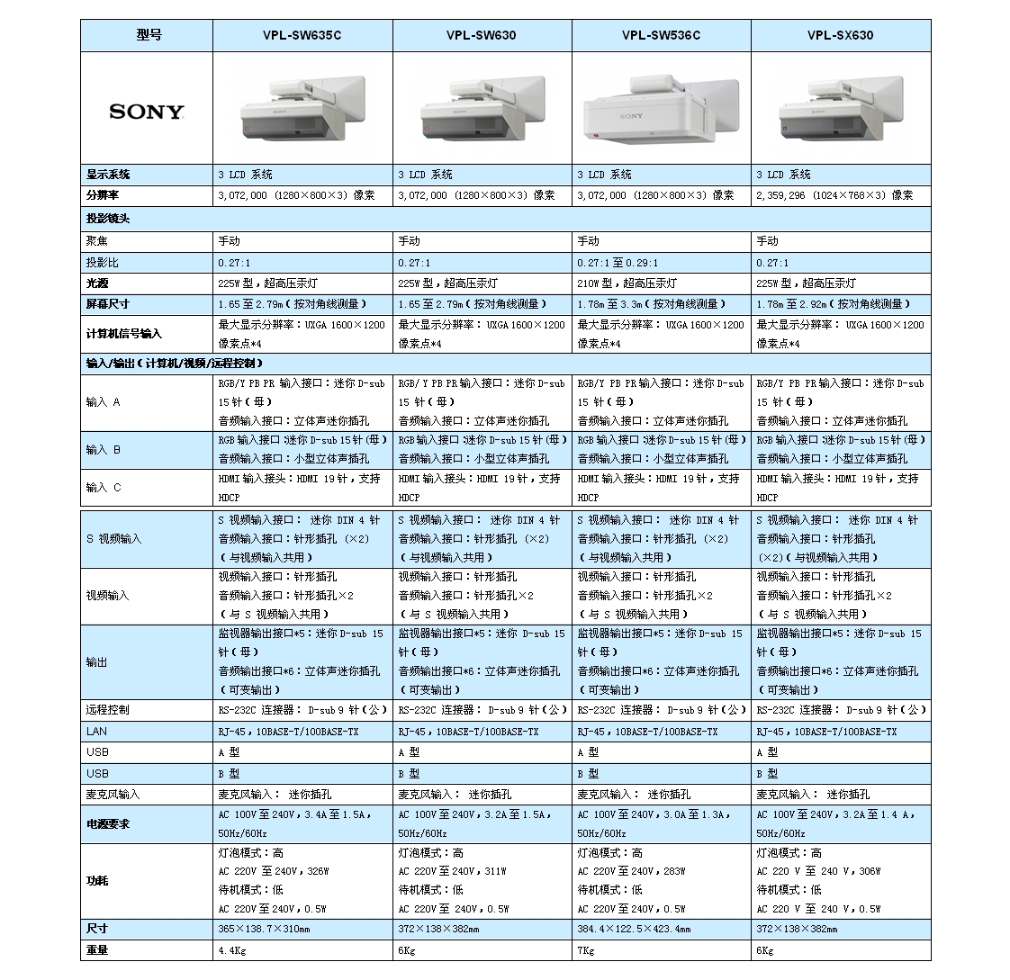 采用索尼的 3LCD BrightEra™ 面板技术,呈现给用户色彩稳定性出色且亮度和对比度较高的 WXGA 影像。投影机强大的 3100 流明色彩亮度输出确保了能够始终清晰地显示演示文稿,即使是在环境光线较强的情况下也是如此。VPL-SW630 易于安装,丰富的接口可连接其他设备,因此能够与学校或办公室网络无缝集成。投影机最前端距离屏幕只需17.38cm,即可投射出80寸画面。投影机镜头中心距离屏幕最短只需46.2cm也可投射出80寸画面。添加可选的 Wi-Fi 模块后,用户可以从 PC、智能手机和平板电脑等设备无线共享作业、影像和图形。内置多个智能节能功能。