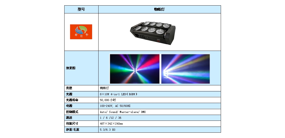 光源:8×10W 4-in-1 LED(RGBW)
