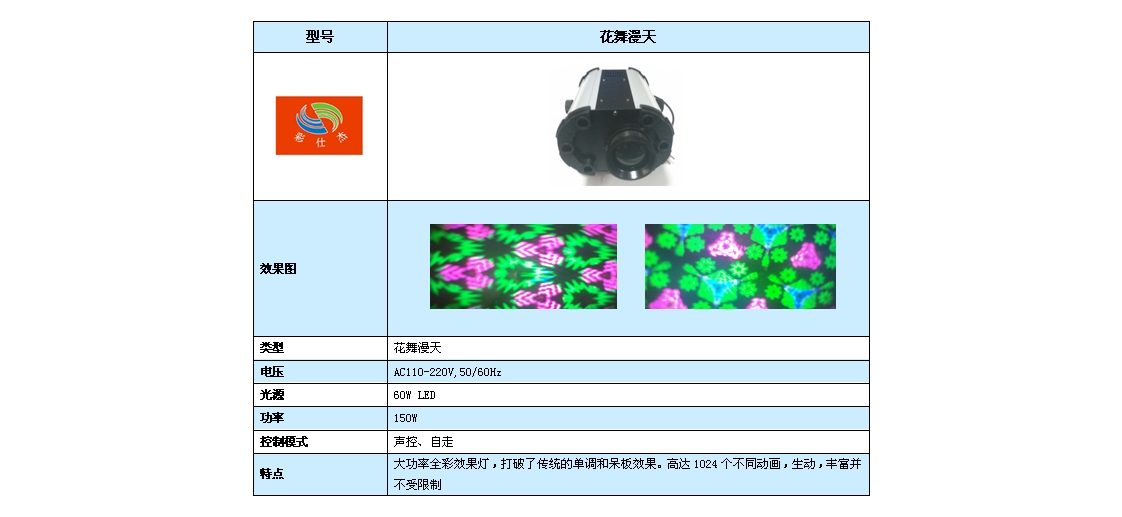 特点:大功率全彩效果灯,打破了传统的单调和呆板效果。高达1024个不同动画,生动,丰富并不受限制。