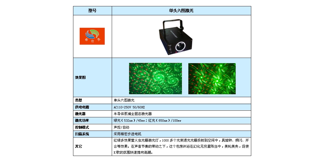 特点:红绿多效果萤火虫光栅激光灯,1000多个光束透光光栅投射到空间中,具旋转、频闪、开合等效果。在声音节奏的带动之下,这个包房沐浴在幻化无穷星阵当中,美轮美奂,促使K歌的氛围快速推向高潮.