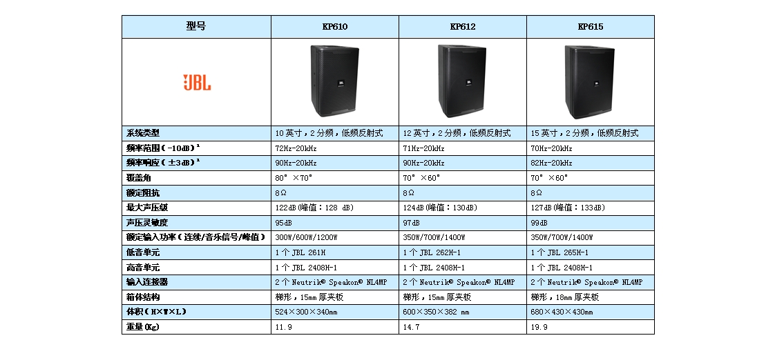 JBL KP600系列是在采用JBL专业技术基础上专为固定安装型卡拉OK开发设计的优质扬声器,包含10英寸、12英寸、15英寸全频扬声器。配备JBL专利技术的高功率低音单元及其著名的高音压缩单元。