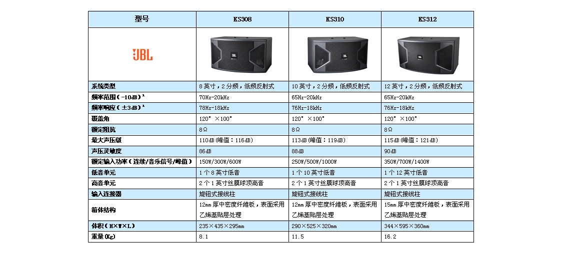 就固定安装型卡拉OK扬声器来说,JBL KS300属于经济实用型,该系列包括8英寸、10英寸、12英寸两分频全频扬声器。传承了JBL的专业技艺,实惠型的KS300系列在保证高度还原音效和人声的前提下带给您满意的卡拉OK体验。