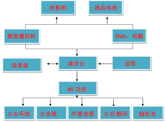 播放系统具备对音频信号的产生、接受、存储、处理的功能。因为用户多用于唱歌,所以播放系统采用支持7.1声道的DVD、硬盘播放机等设备。DVD是目前家庭影院播放系统的基本配置,比较普及,价格也实惠。硬盘播放机内存大小500G足以,兼容MP4、DVD、VCD、MP3、JPG等多种数据格式。
