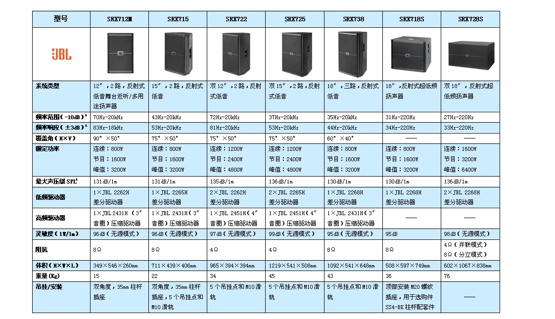 SRX700系列中的扬声器,让您更放心使用的新一代低频驱动器,这种新型驱动器比同类产品其它牌子的性能更好,重量更轻,灵敏度更高,功率更大,可靠性更强,充分显示了JBL喇叭的卓越风范。