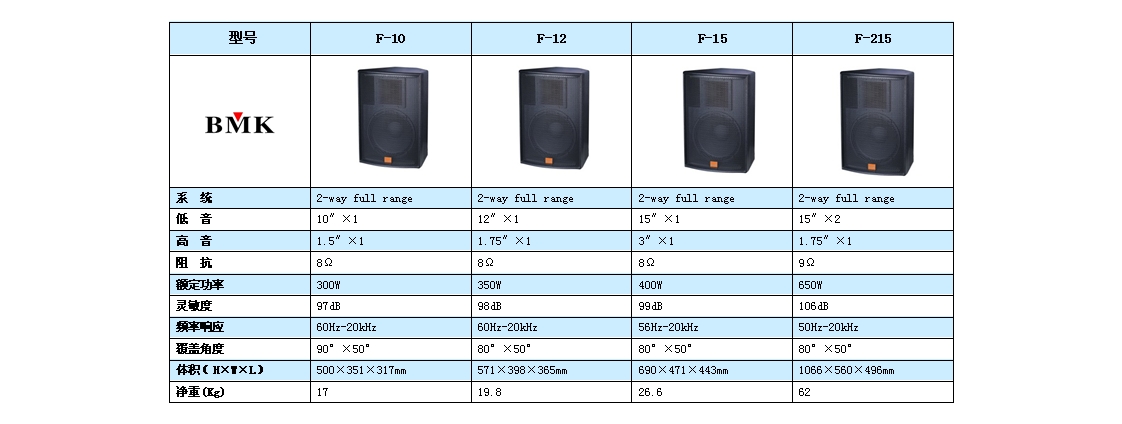 F系列的设计理念着重于中高频的清晰细腻,中低频的强劲有力,它的音色亮丽,频响平滑,优胜的特性在于其专业的号角高音,它与普通的两分频音箱对比,具有灵敏度更高,频响更宽,声压级更大,人声更突出的优势。