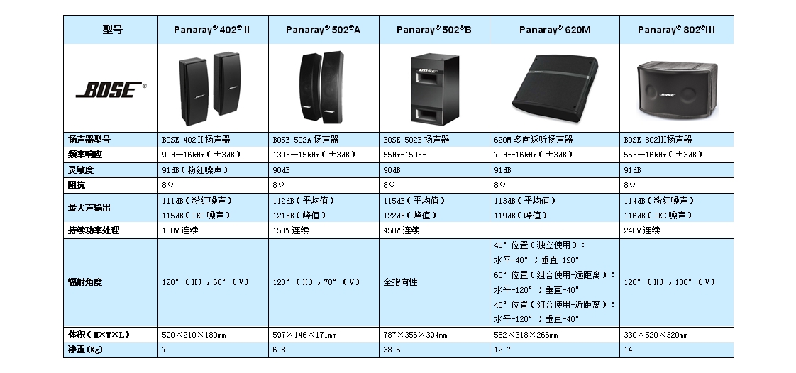 502B Acoustimass®「音响气量流」低频扬声器专门设计作为系统组件,用于Bose 402,Panaray™ 502, Bose 802III和Panaray LT音频系统。相应的系统控制器或插入式均衡模块提供正确的信号处理,确保在各种系统配置情况下都有自然、丰富、饱满的音色。
